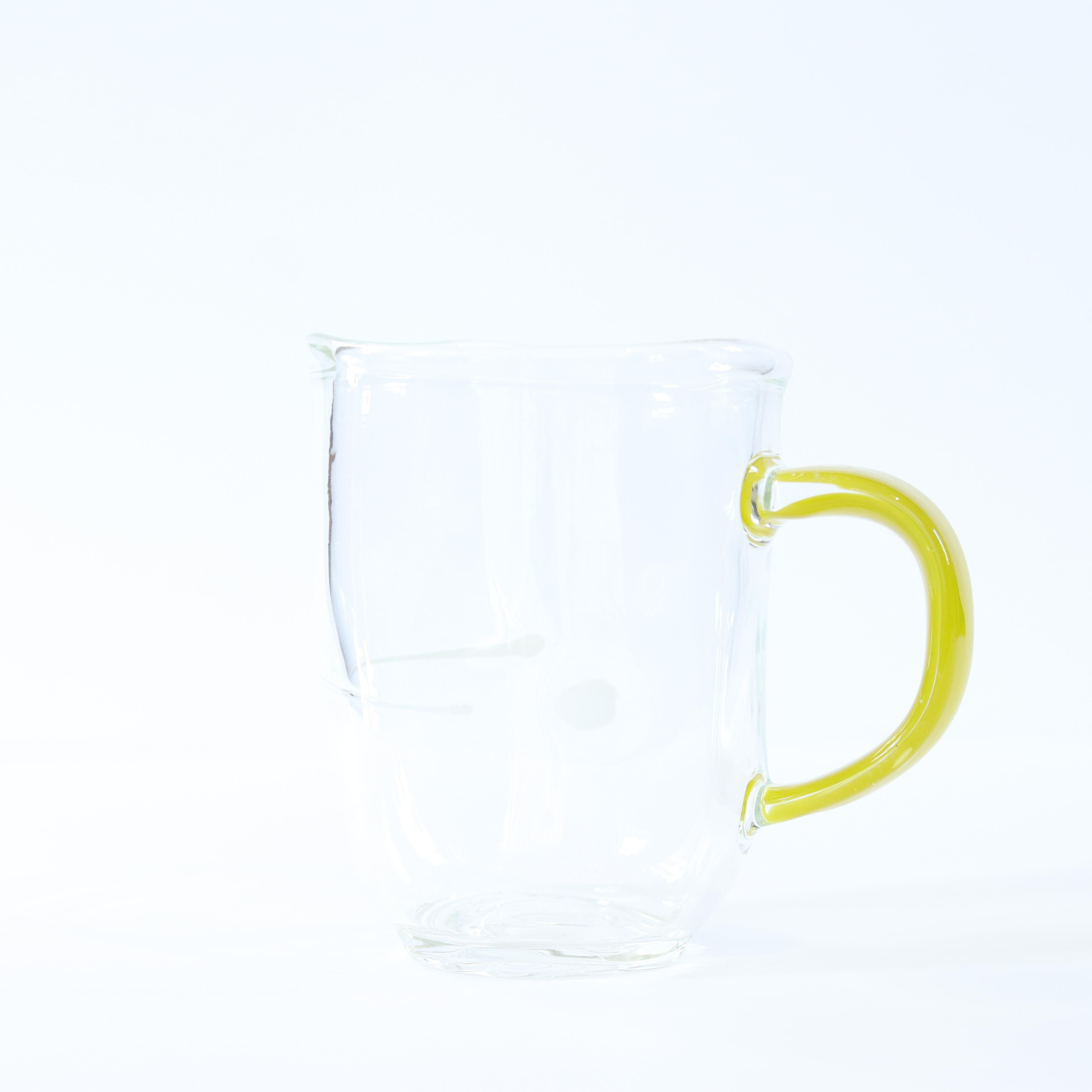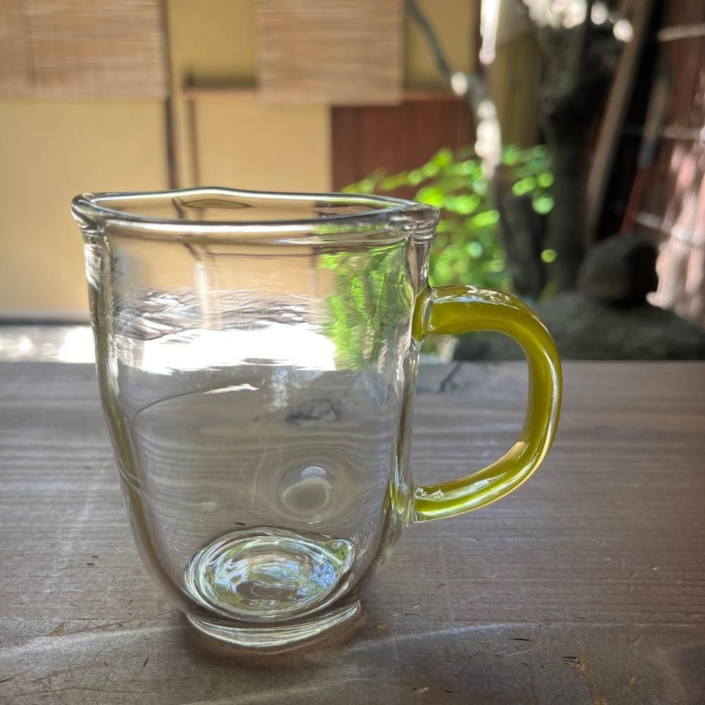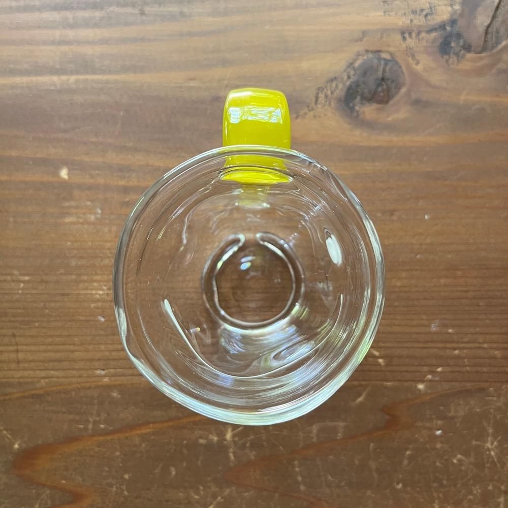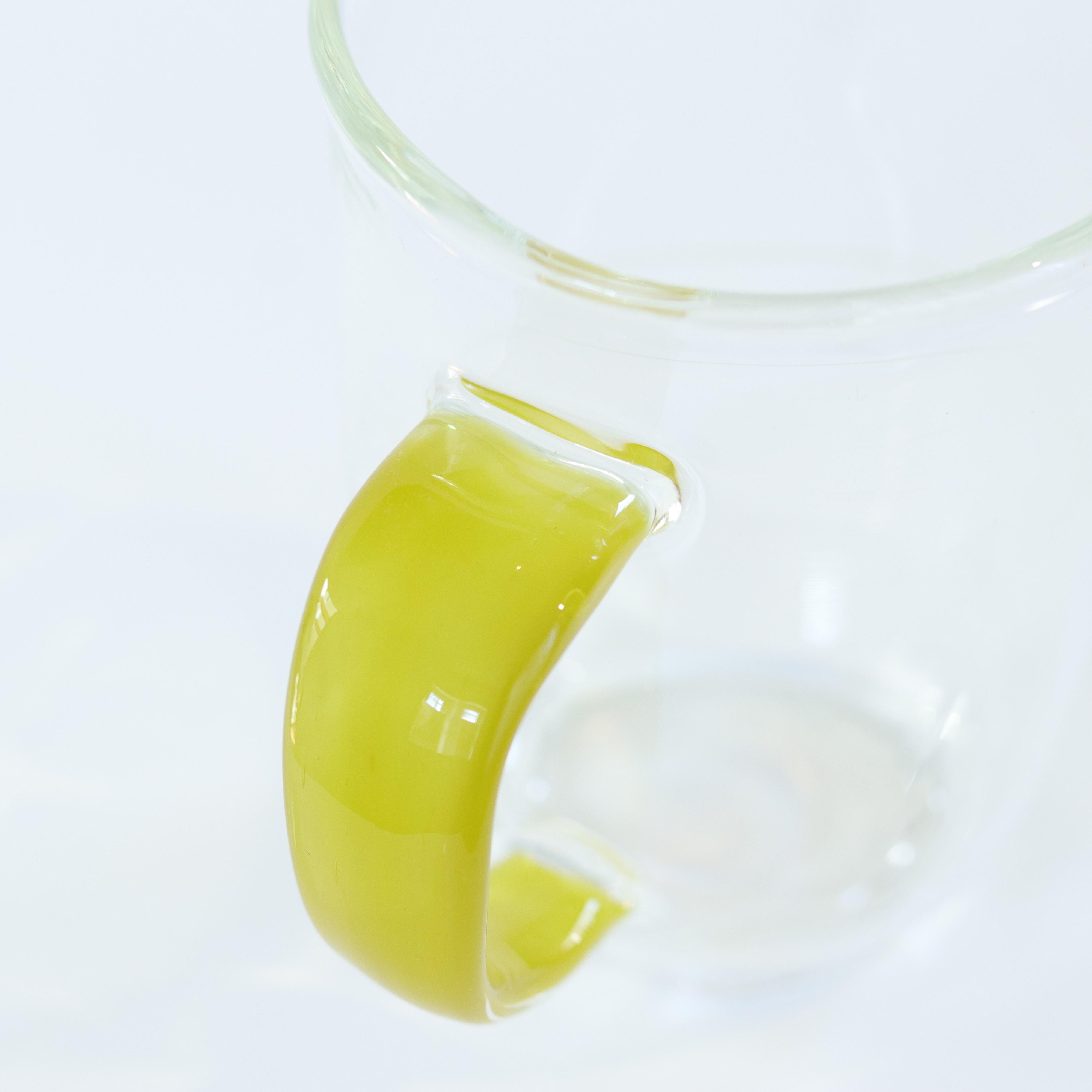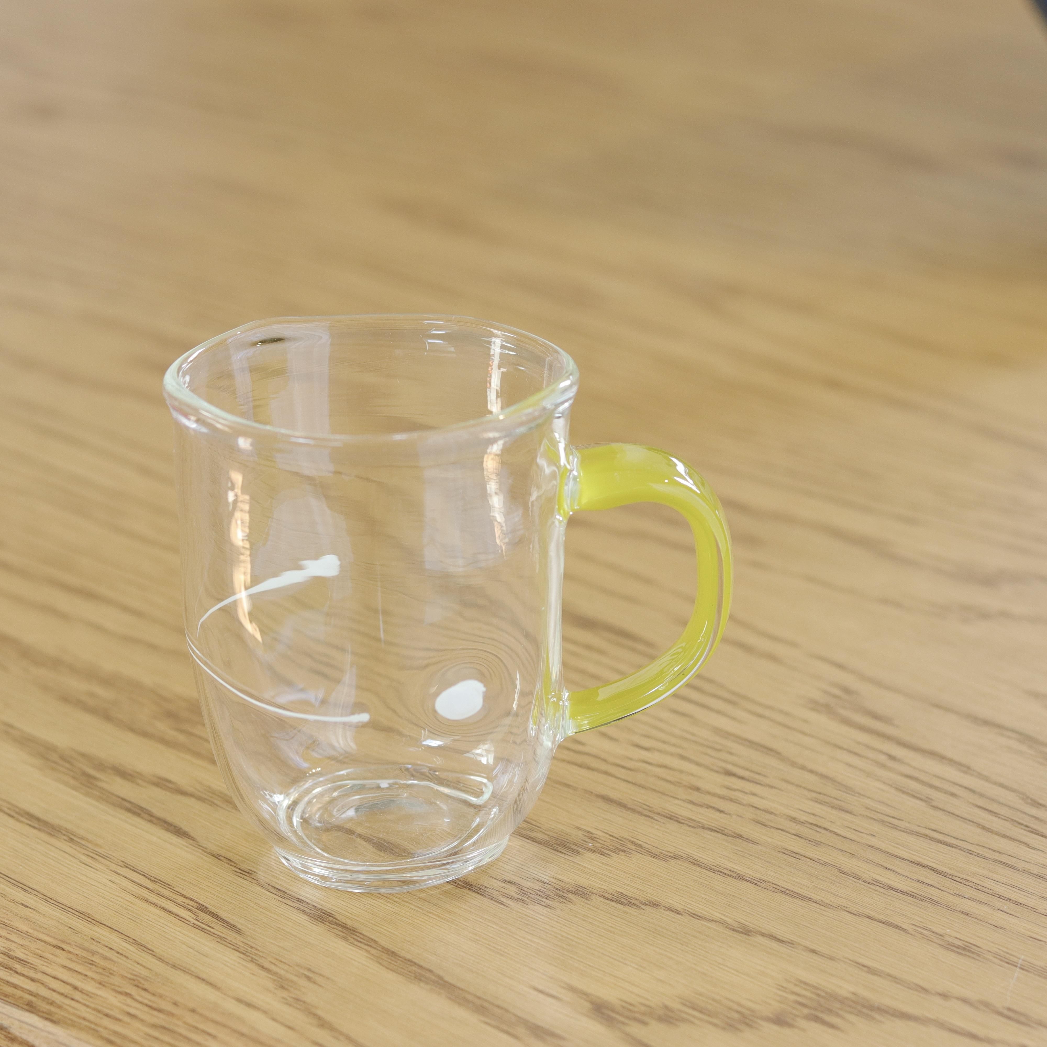 ガラス作家・渡邊徳明さんの代名詞とも言える長年の定番「カラー取手のマグカップ」。軽くて丈夫な耐熱ガラスですので、日常色々な用途で末長くお使い頂けます。