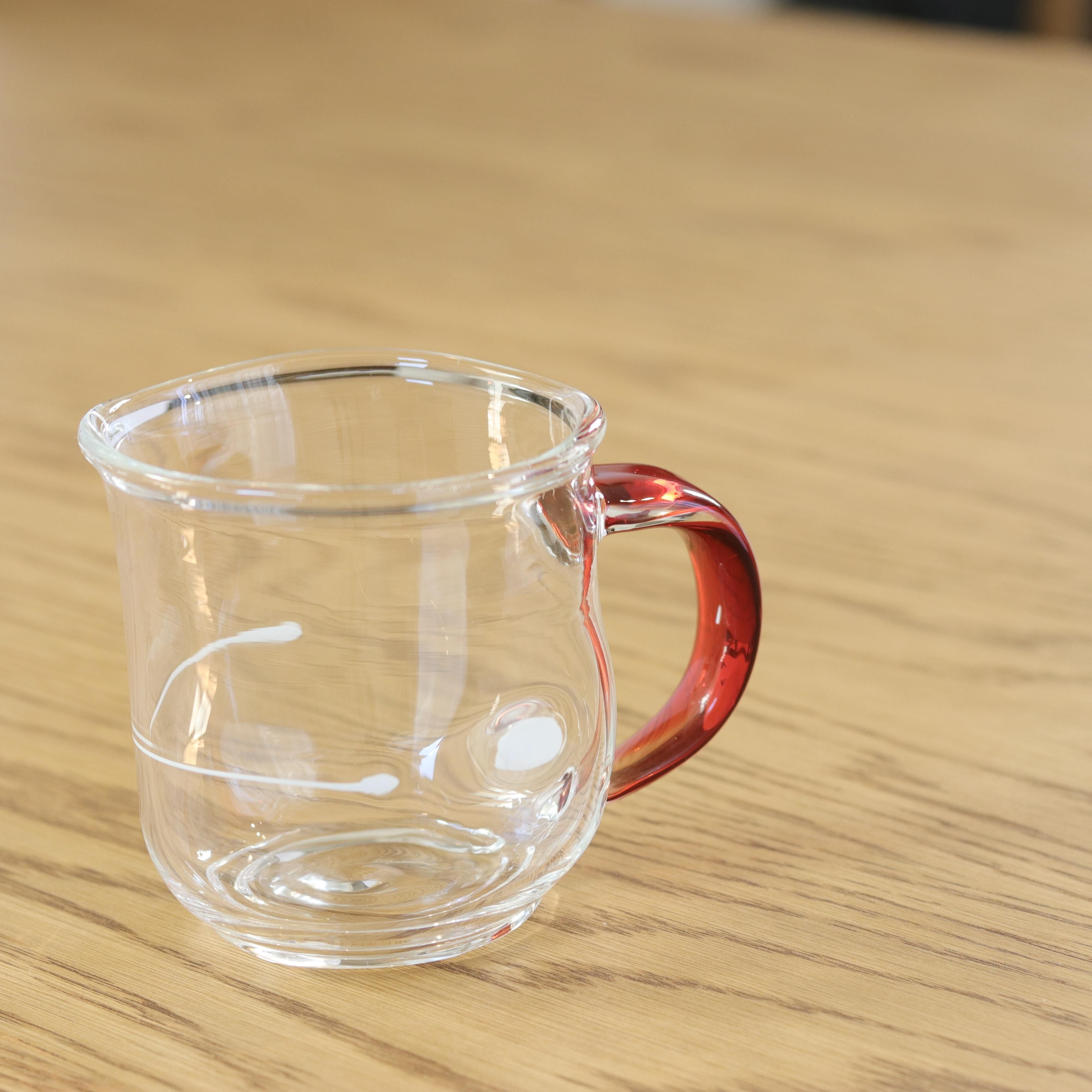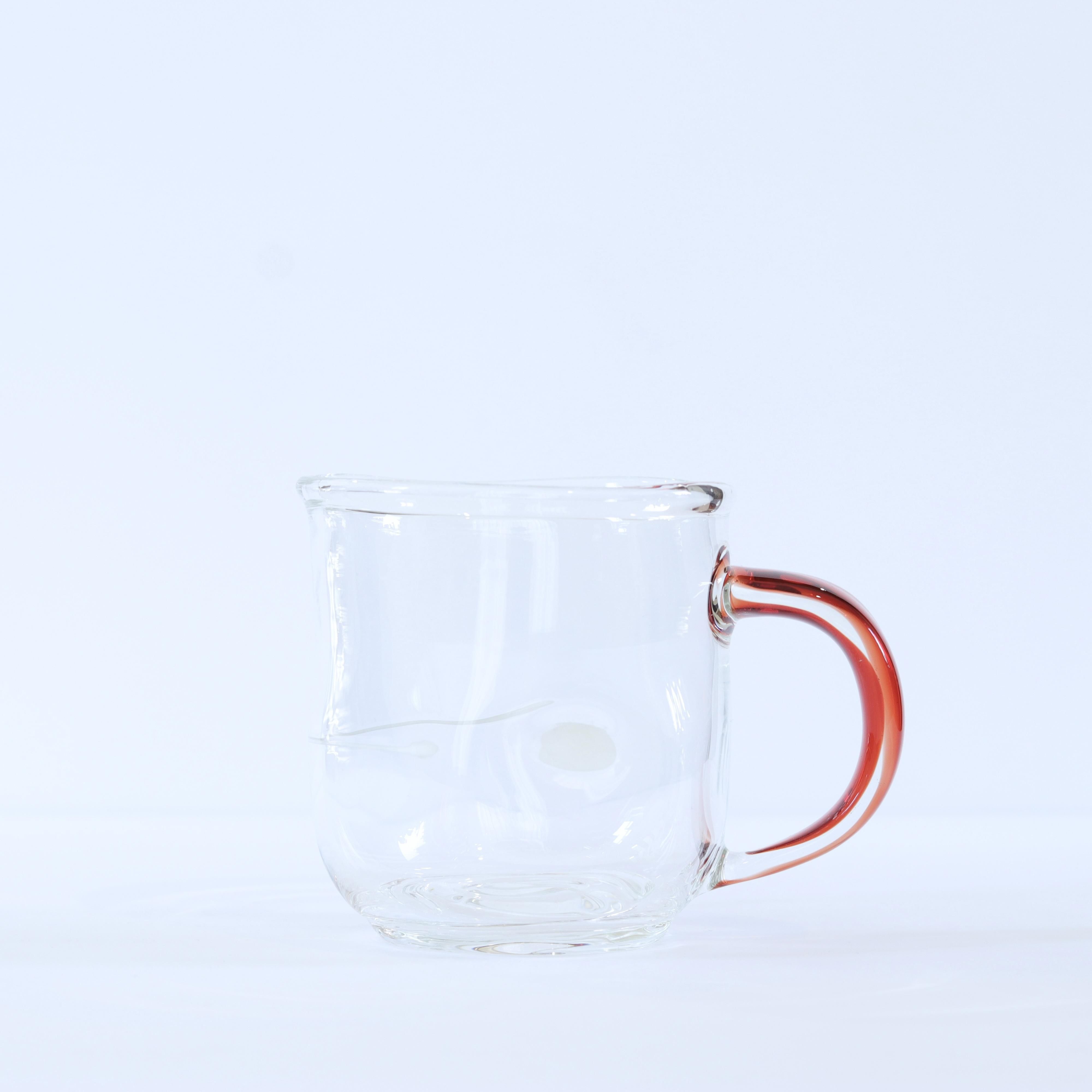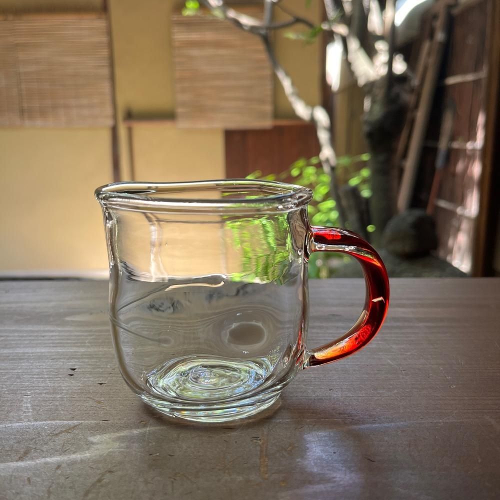 ガラス作家・渡邊徳明さんの「カラー取手のマグカップ」。定番サイズのものより高さが若干低く、胴は一回り大きくなっております。軽くて丈夫な耐熱ガラスですので、日常色々な用途で末長くお使い頂けます。