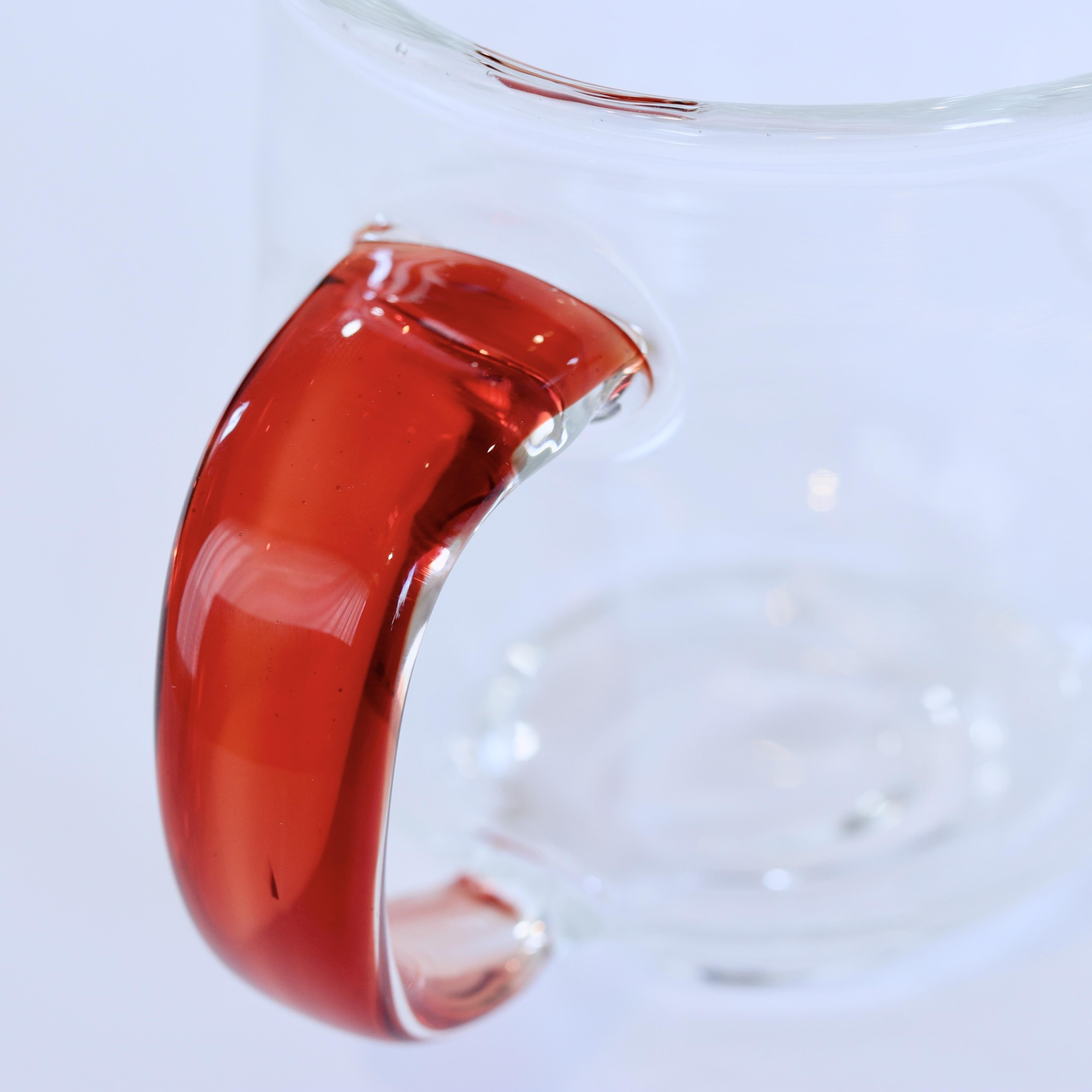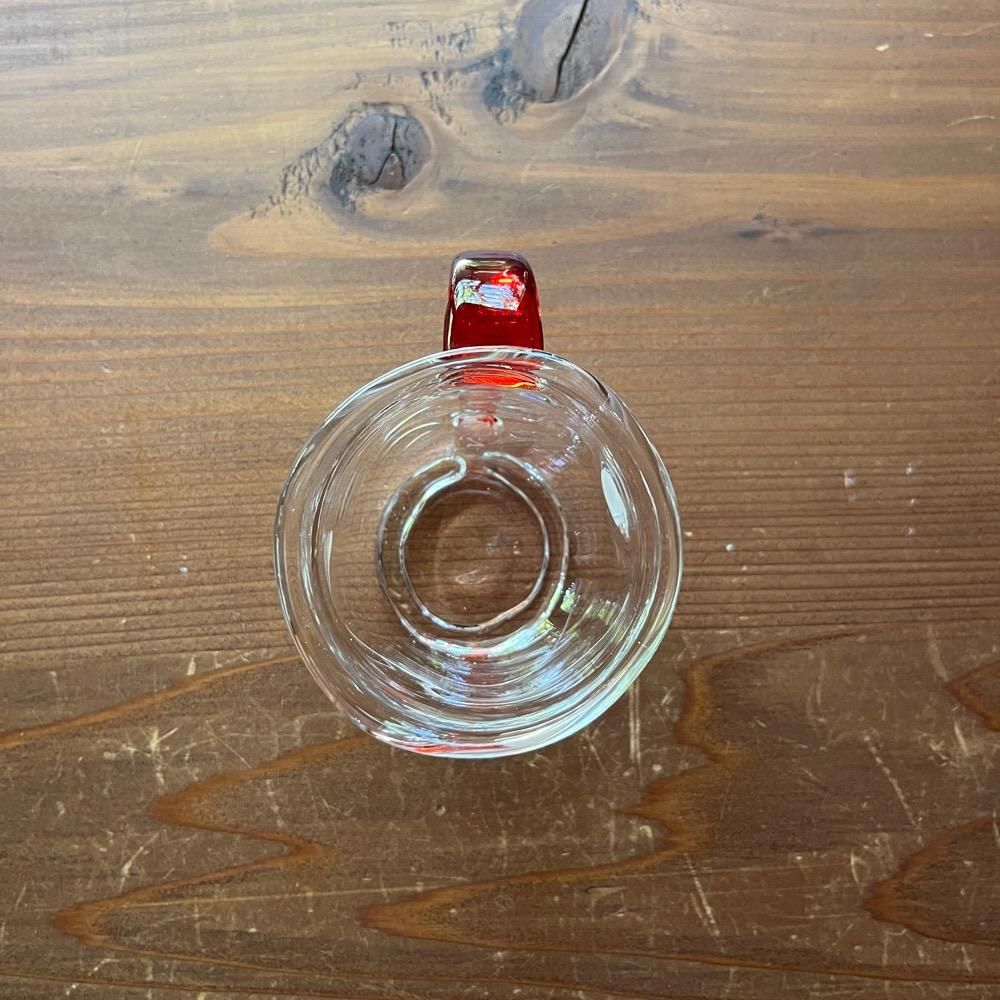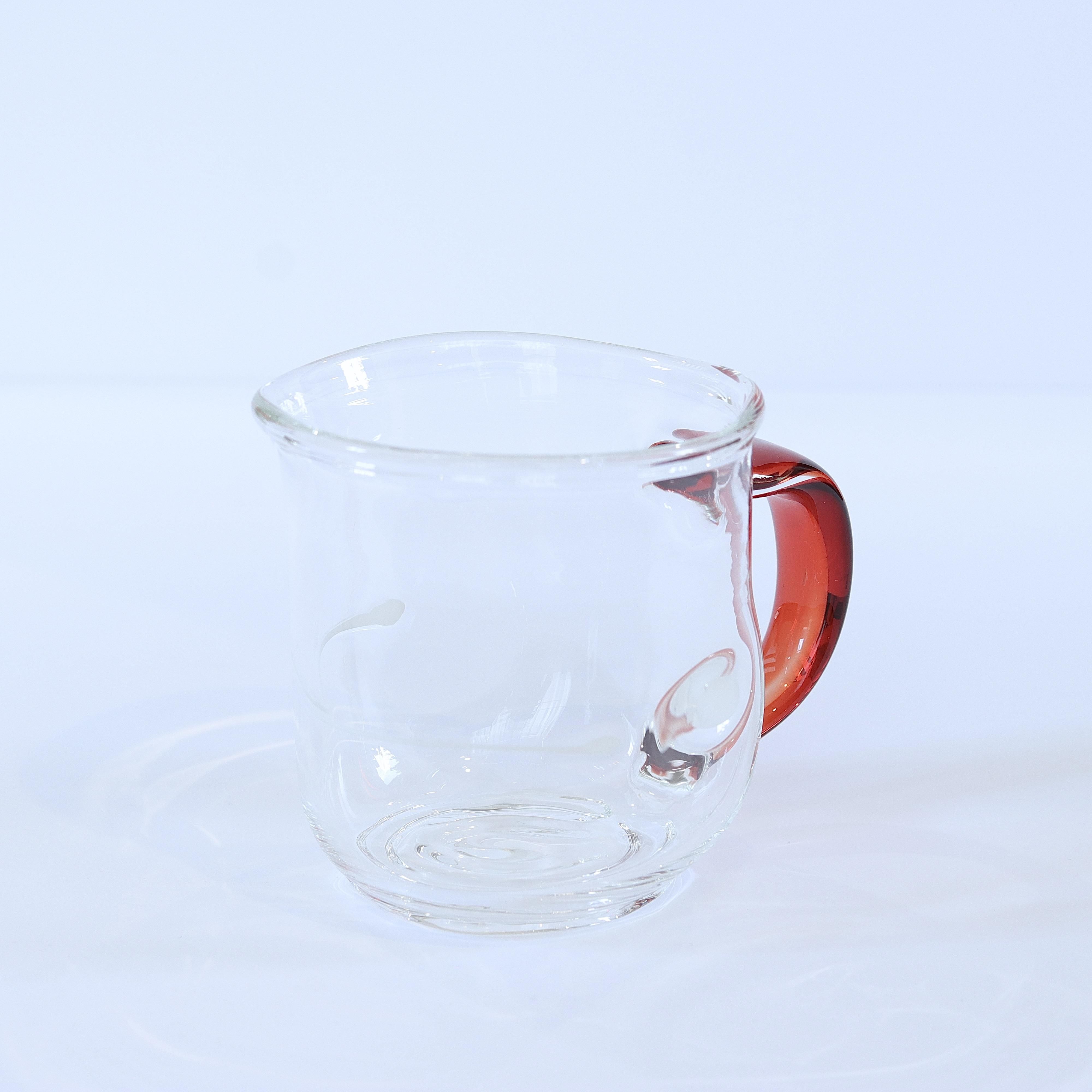 ガラス作家・渡邊徳明さんの「カラー取手のマグカップ」。定番サイズのものより高さが若干低く、胴は一回り大きくなっております。軽くて丈夫な耐熱ガラスですので、日常色々な用途で末長くお使い頂けます。