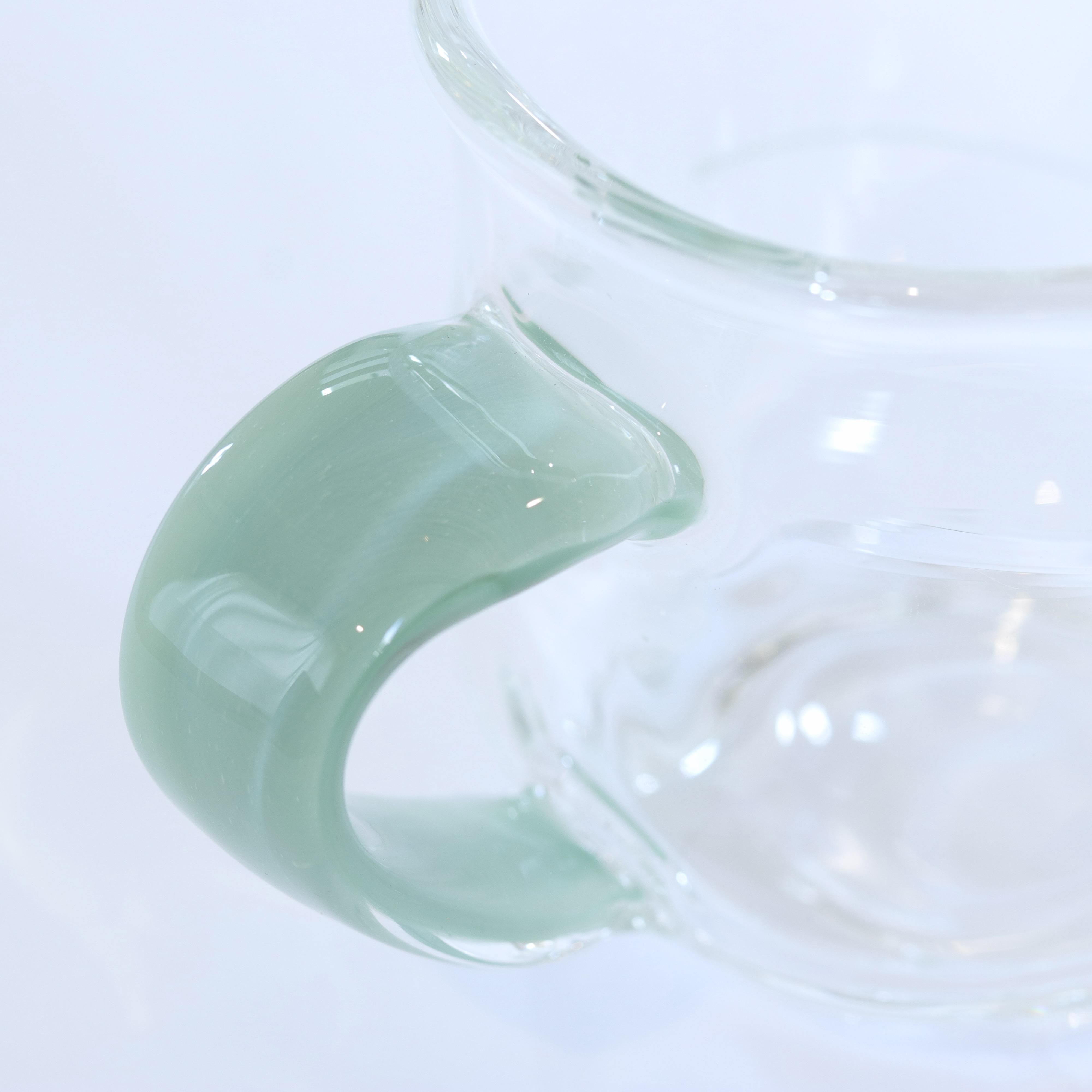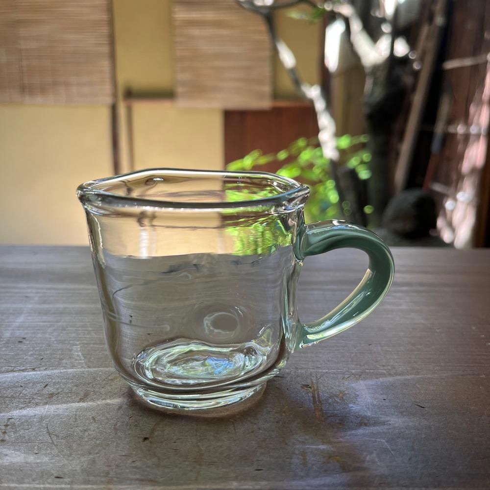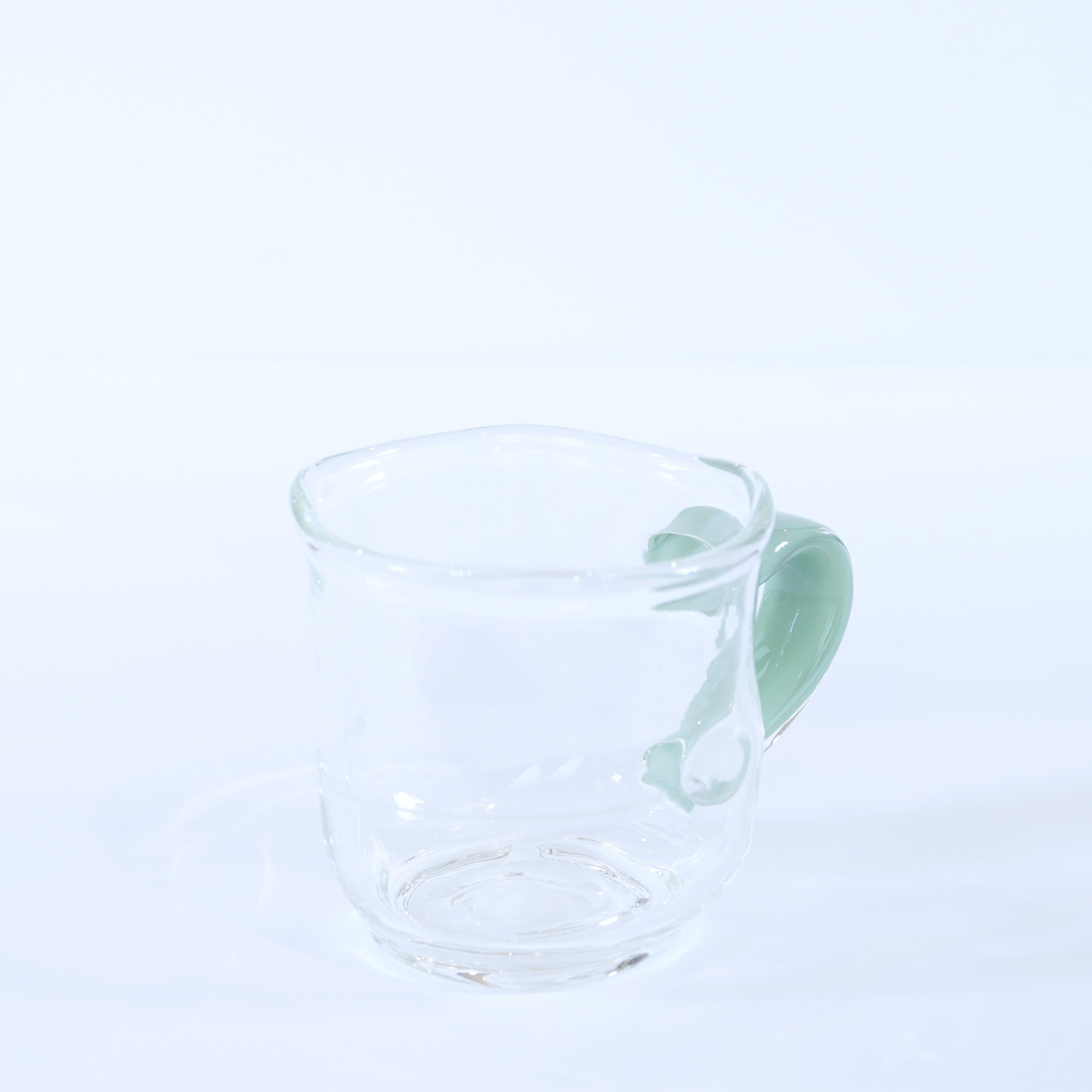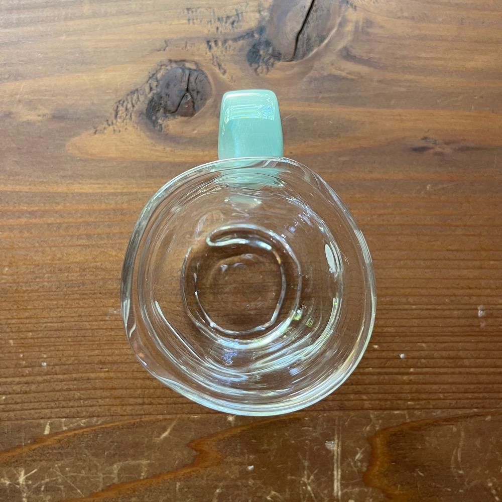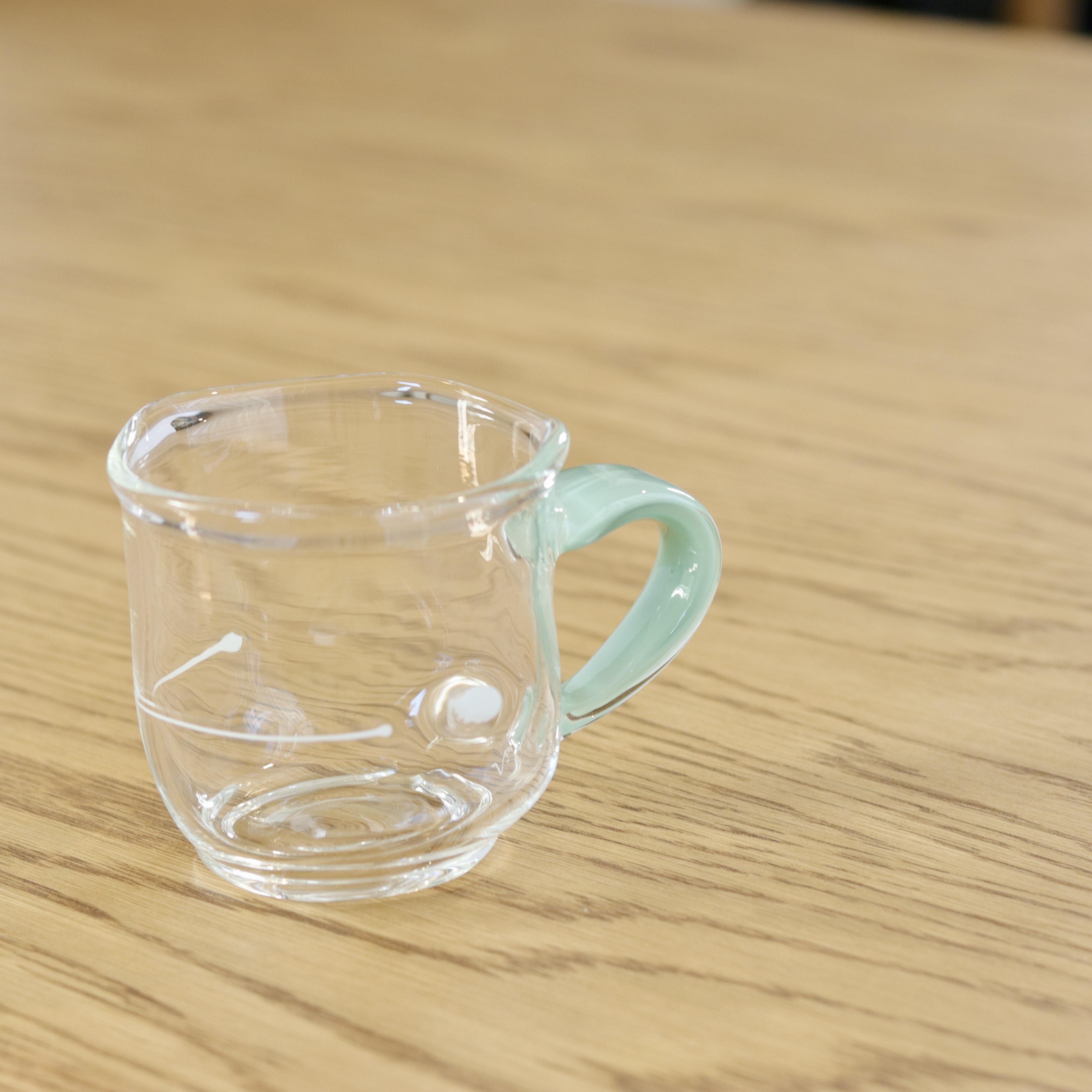 ガラス作家・渡邊徳明さんの「カラー取手のマグカップ」。定番サイズのものより高さや胴径が小さくなっております。軽くて丈夫な耐熱ガラスですので、日常色々な用途で末長くお使い頂けます。