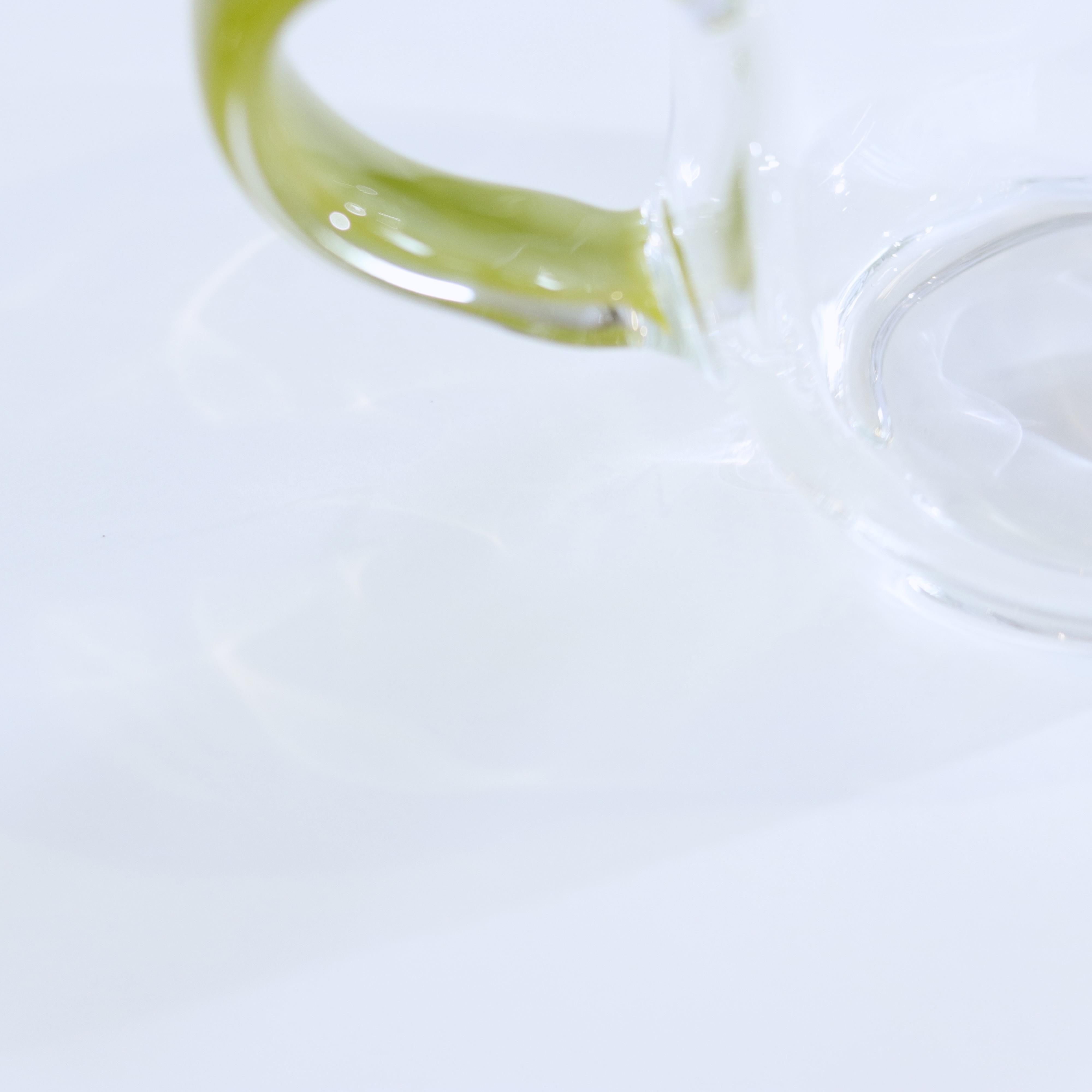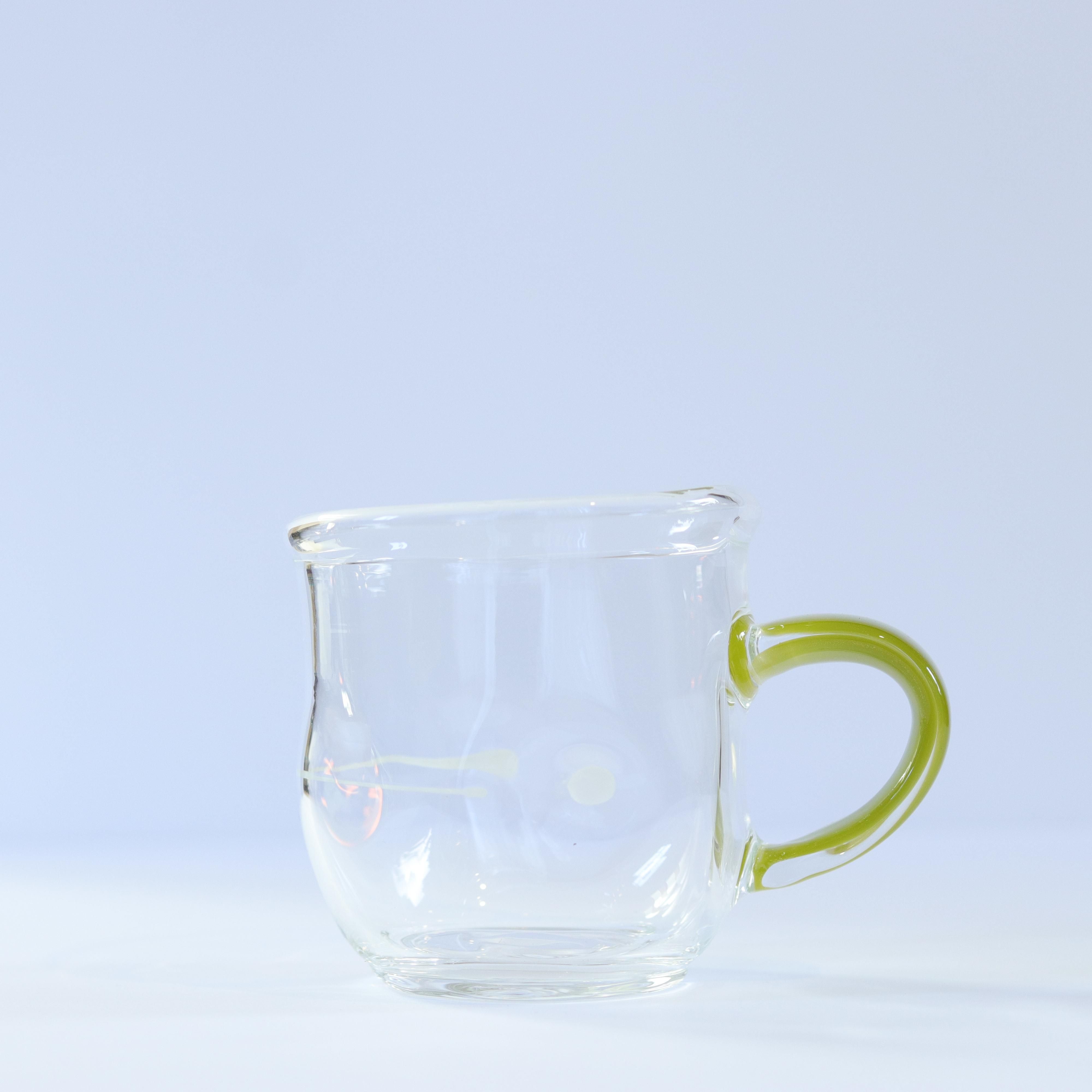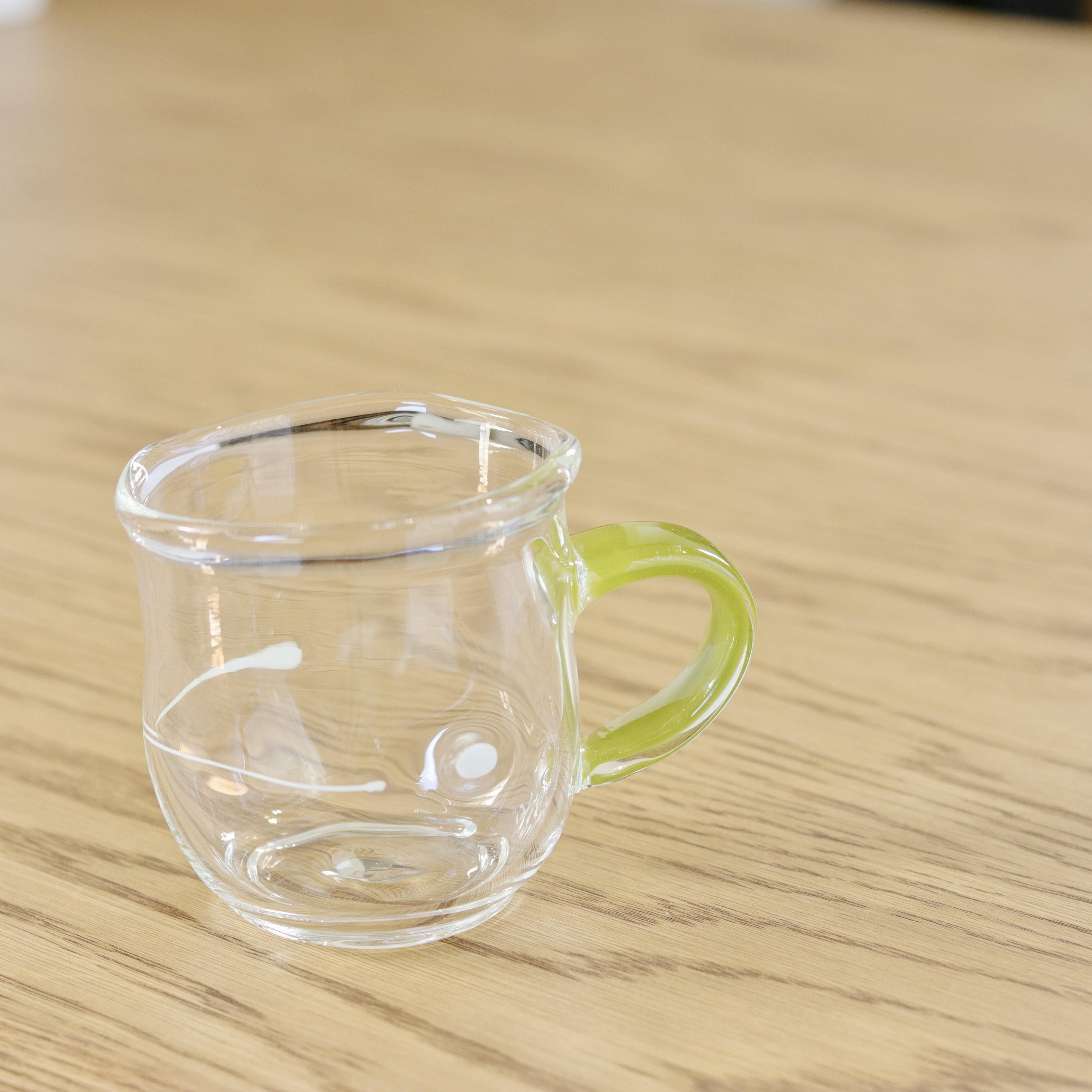 ガラス作家・渡邊徳明さんの「カラー取手のマグカップ」。定番サイズのものより高さや胴径が小さくなっております。軽くて丈夫な耐熱ガラスですので、日常色々な用途で末長くお使い頂けます。