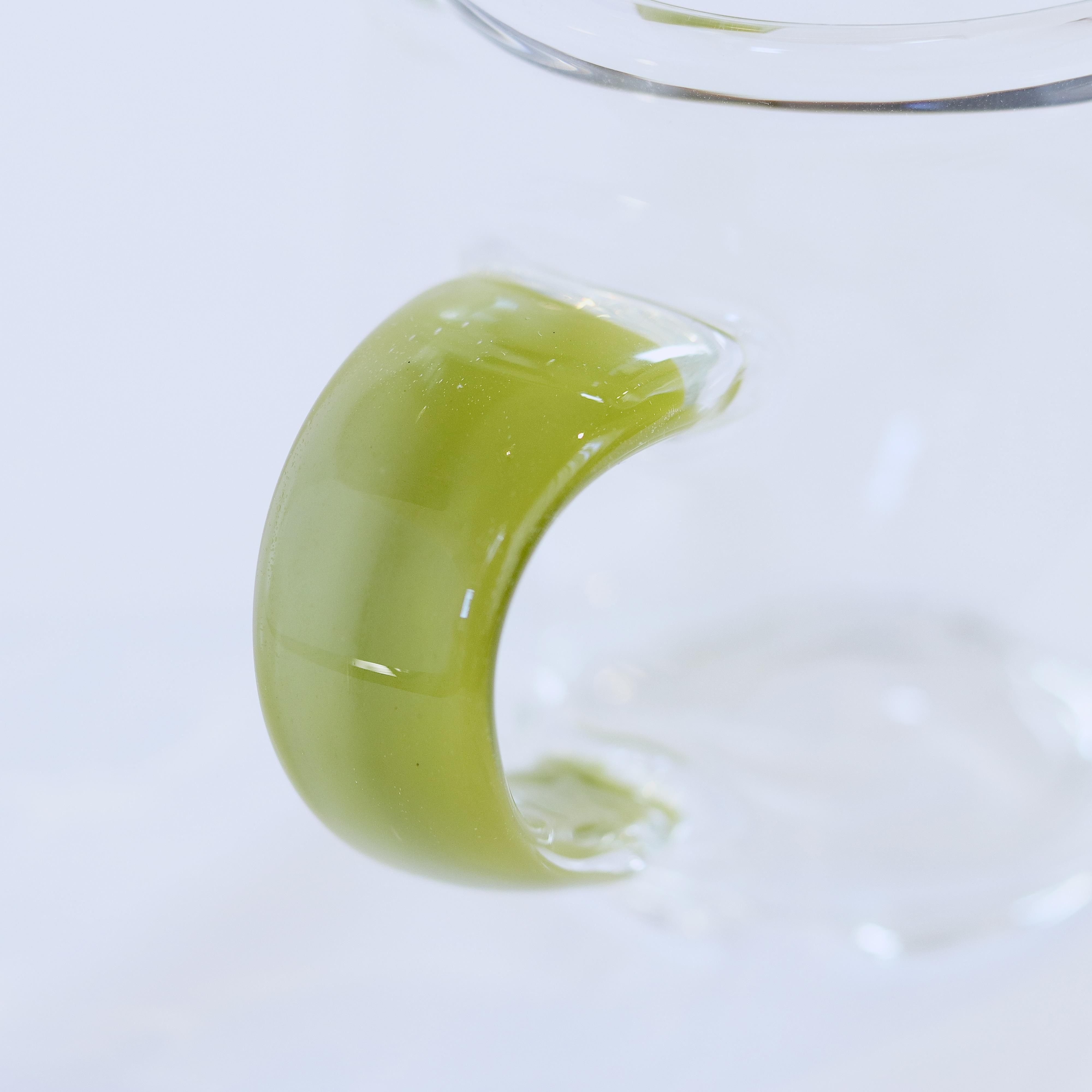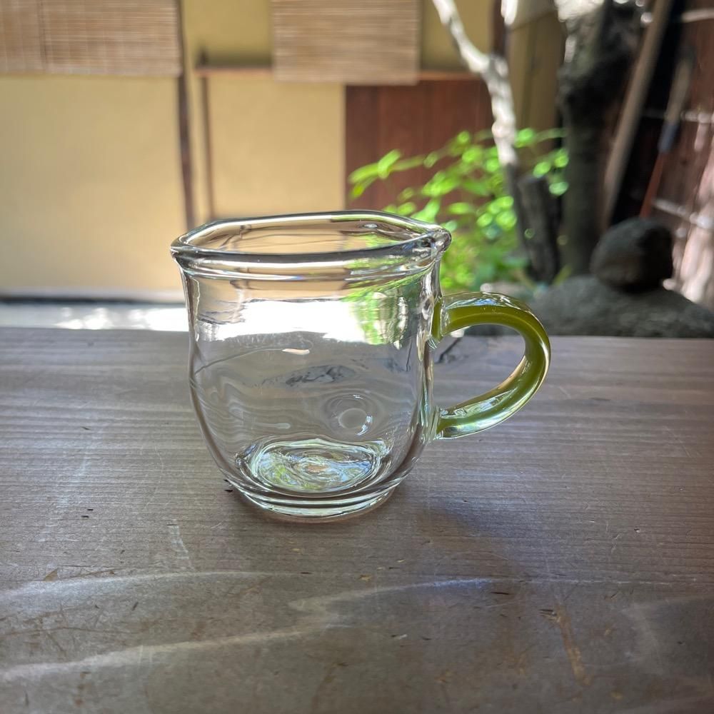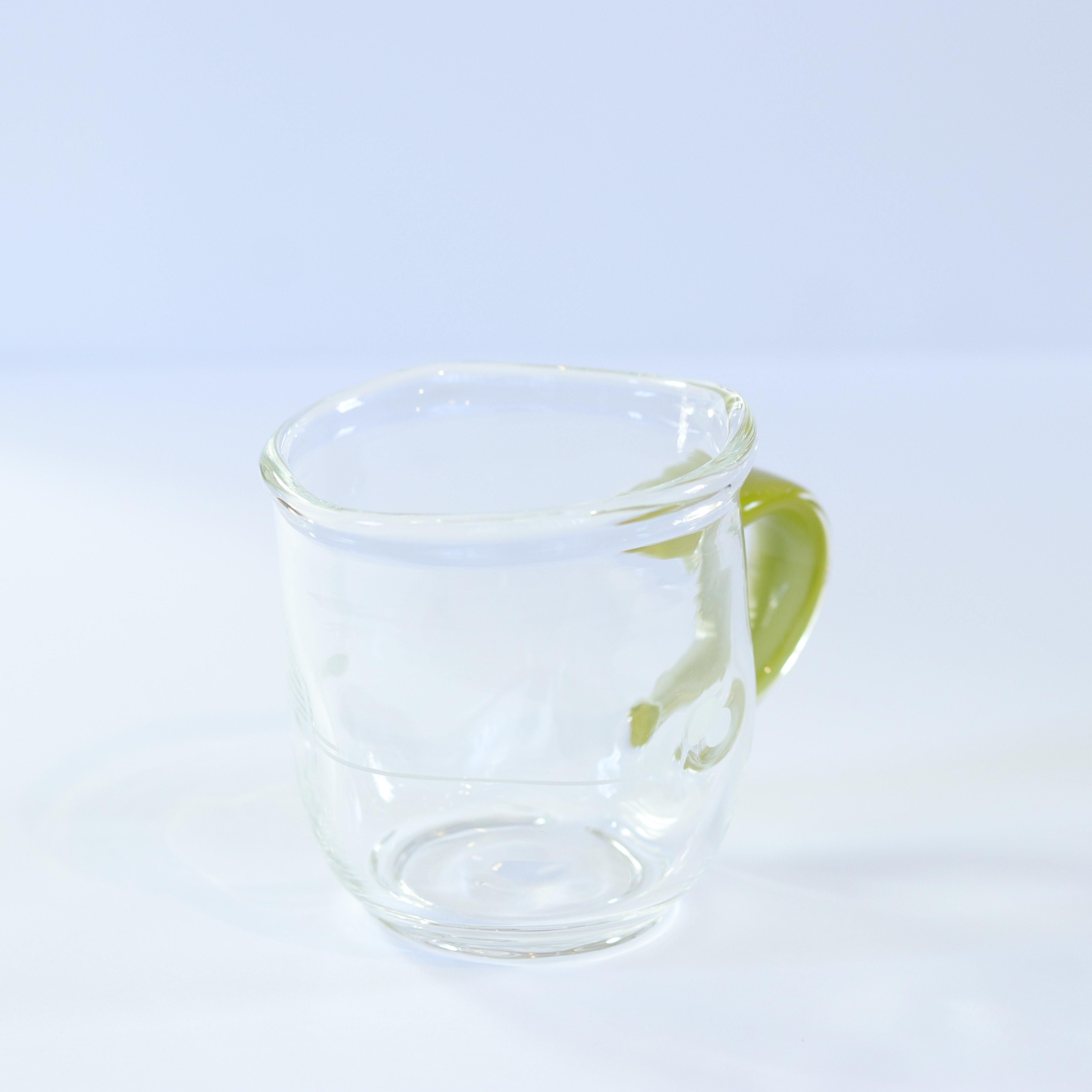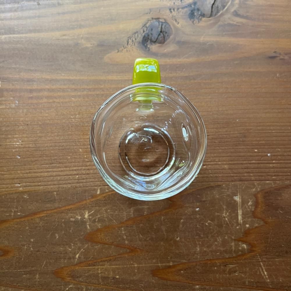 ガラス作家・渡邊徳明さんの「カラー取手のマグカップ」。定番サイズのものより高さや胴径が小さくなっております。軽くて丈夫な耐熱ガラスですので、日常色々な用途で末長くお使い頂けます。