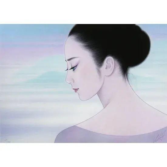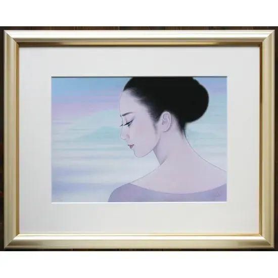 2017年夏に発表された新作版画。日本画のような柔らかなタッチと色彩で背景の遠山と雲海が丁寧に描かれ、やはり日本女性の美の究極とも言える姿が表現された秀作です。
