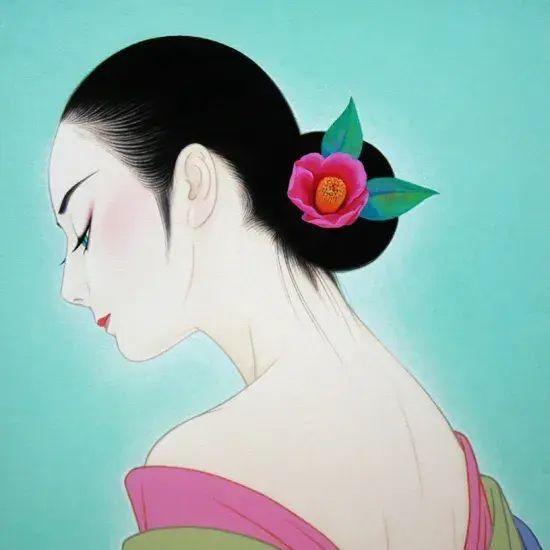透き通る様な肌の色、そして寒色の背景の中に、暖かさを感じさせる椿が一輪。寒さに耐え春を待つ、そんな清々しい美しさがここにはあります。さらに大きな額装画像はこちらのブログ記事をご参照下さい。