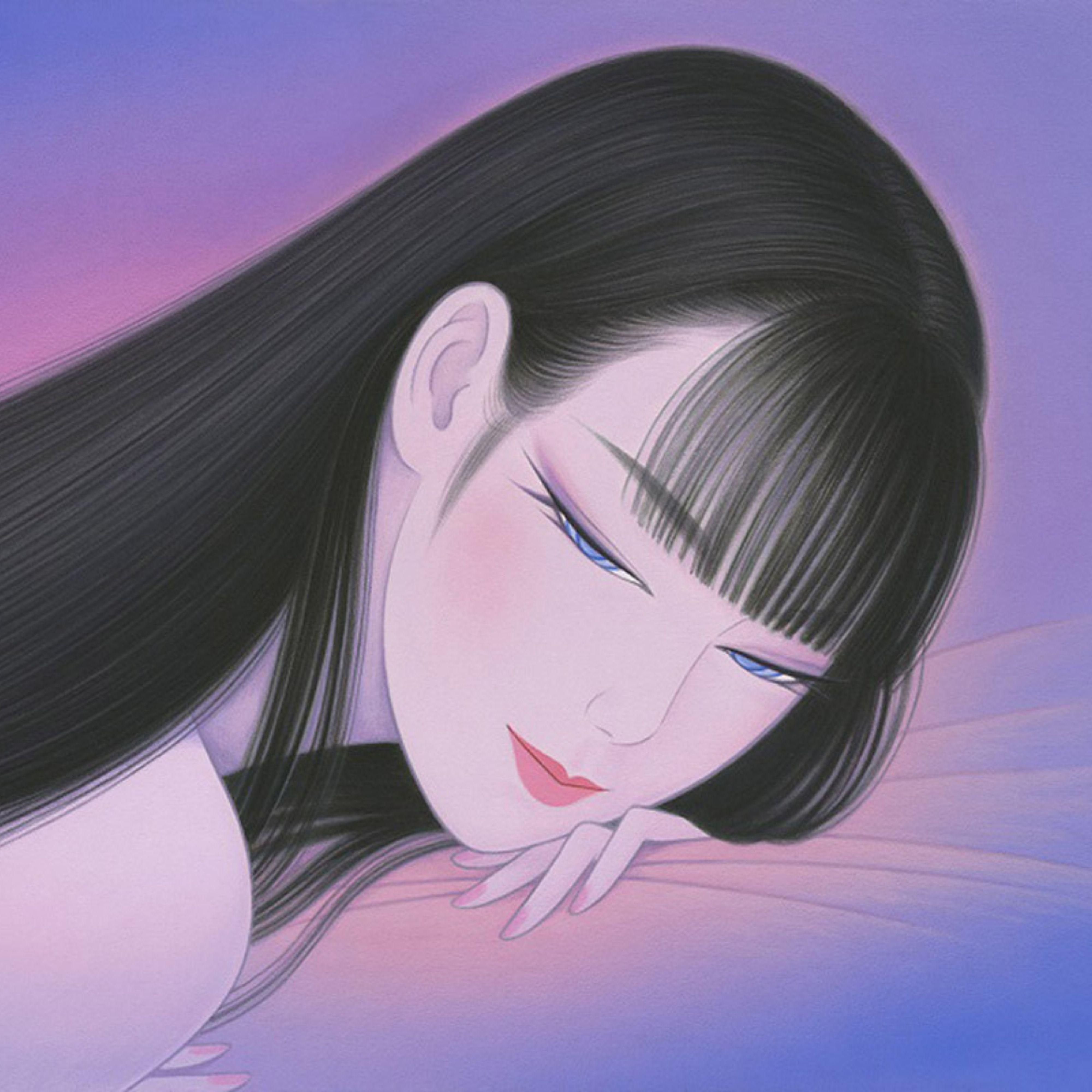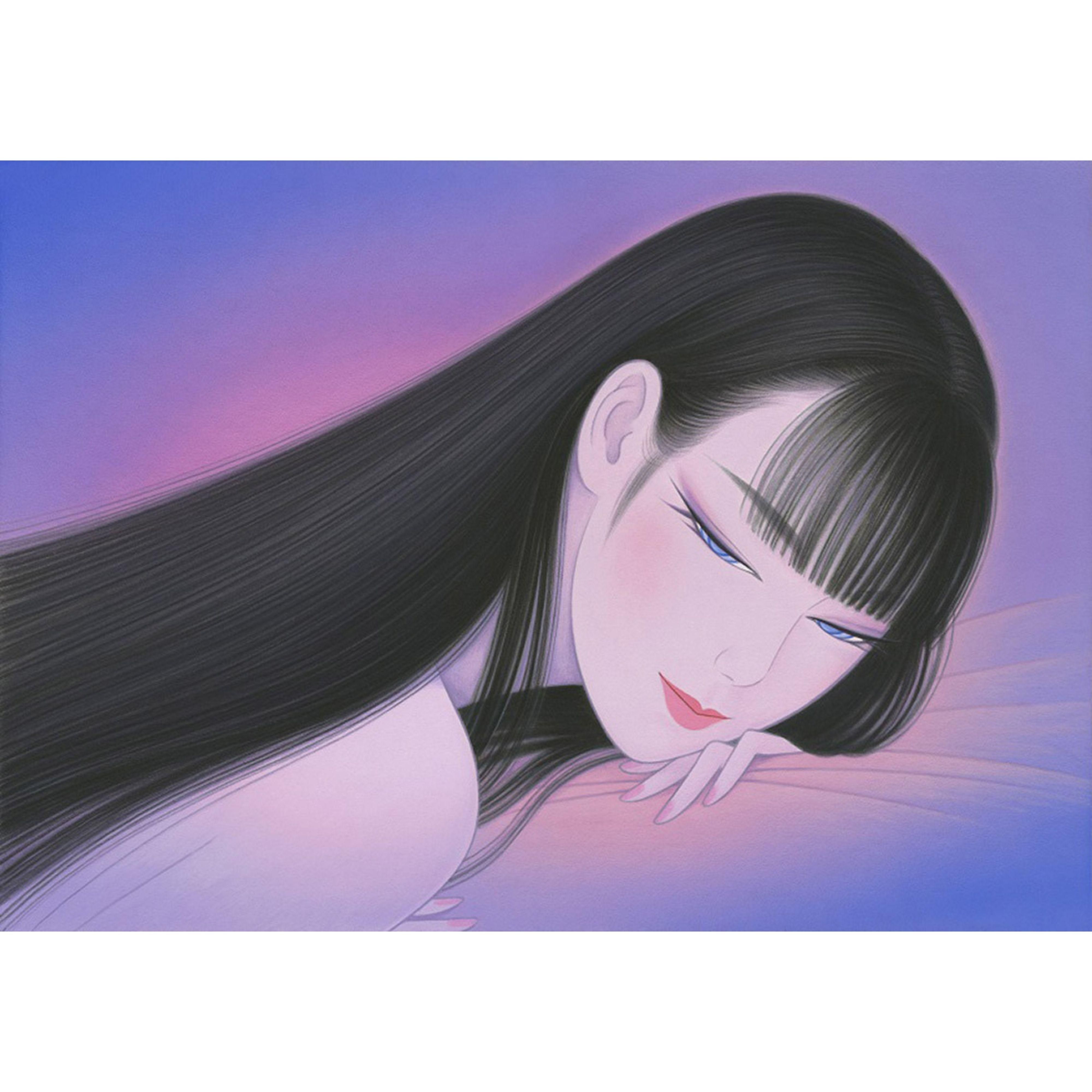 長く流れる黒髪、うっすらと頬を染めた表情、そしてどこか切なげな瞳が、見る人の心をそっと包み込みます。